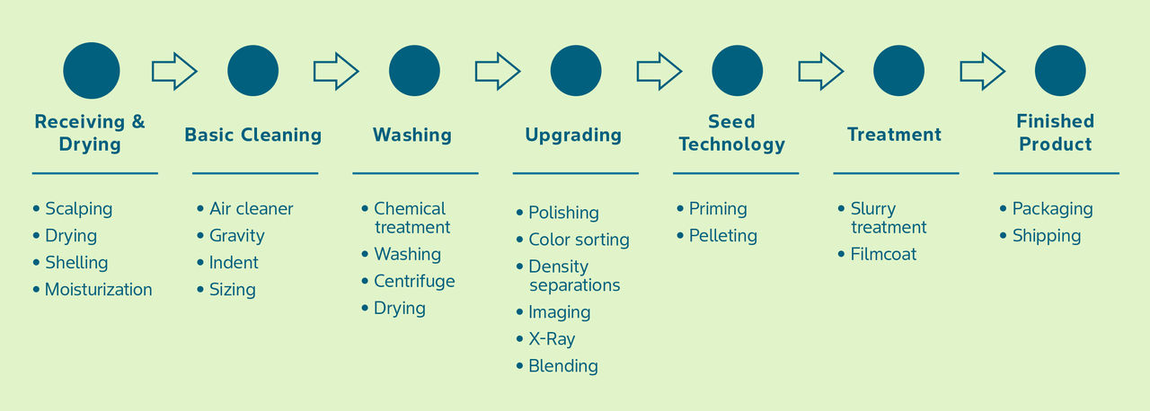 Seed processing refers to the series of operations that seeds undergo after harvesting to prepare them for packing. This process includes several steps to remove impurities, achieve the optimal moisture level, sorting seed to ensure uniformity, enhancement, application of treatments to protect seeds from pest and diseases during storage and germination.