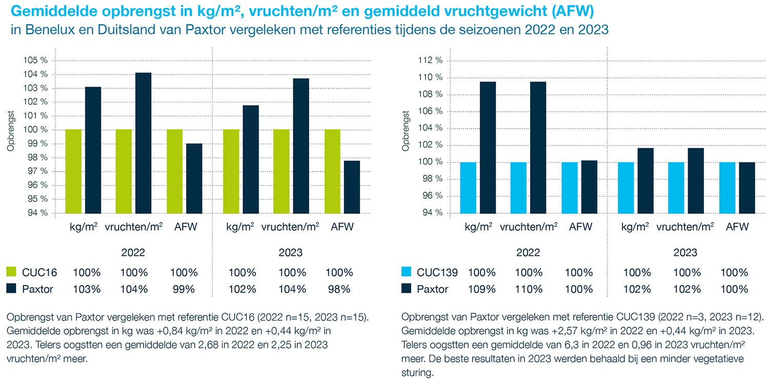 - // Planting rate: starting density 1,25-1,50 stems/m² for umbrella crop system // Paxtor forms an average of 1 more leaf on the stem than its main competitors. Do not overload the main stem with too many fruits to obtain a higher average fruit weight. This will result in a higher % of >400-gram fruits. // Keep the crop open enough by maintaining a sufficient high 24-hour temperature and if needed by picking some leaves. This may help with a generative balance and high qualitative production potential. // Avoid fruit condensation by heating up the glasshouse in time. Timely screening is recommended to minimize the risk of sunburn and/or cold stripes. In March/April screening from 450 Watts is advised. // Avoid a too low humidity deficit to prevent and reduce disease pressure.