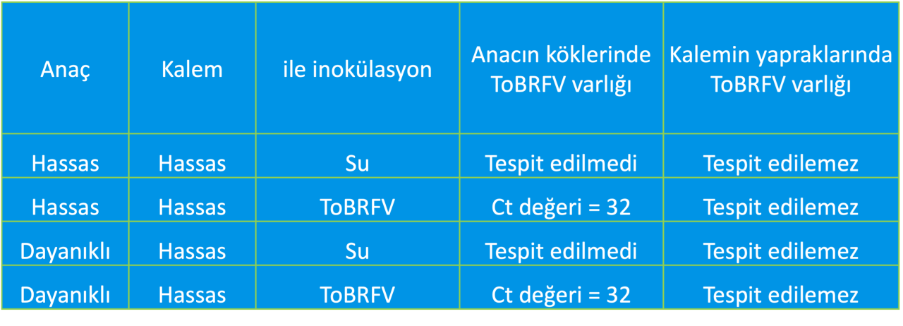 Sonuçlar, taşyünü bloğun ortasındaki köklerin (yani başlangıçta enfekte olan köklerin değil) çok düşük seviyelerde ToBRFV gösterdiğini ortaya koymuştur. PCR değerleri 32 civarındaydı ve virüs partiküllerinin varlığına işaret ediyordu. Biyolojik uygunluk açısından, bitkide gerçek bir ToBRFV enfeksiyonunu tanımlamak için yetersizdir. Filizin yapraklarında hiç virüs tespit edilmemiştir, bu da ToBRFV'nin köklerden filizin sürgünlerine taşınmadığını göstermektedir. Virüsün köklerden çok az alındığını veya hiç alınmadığını gösteren bu sonuç, diğer araştırmalarla uyumludur*.