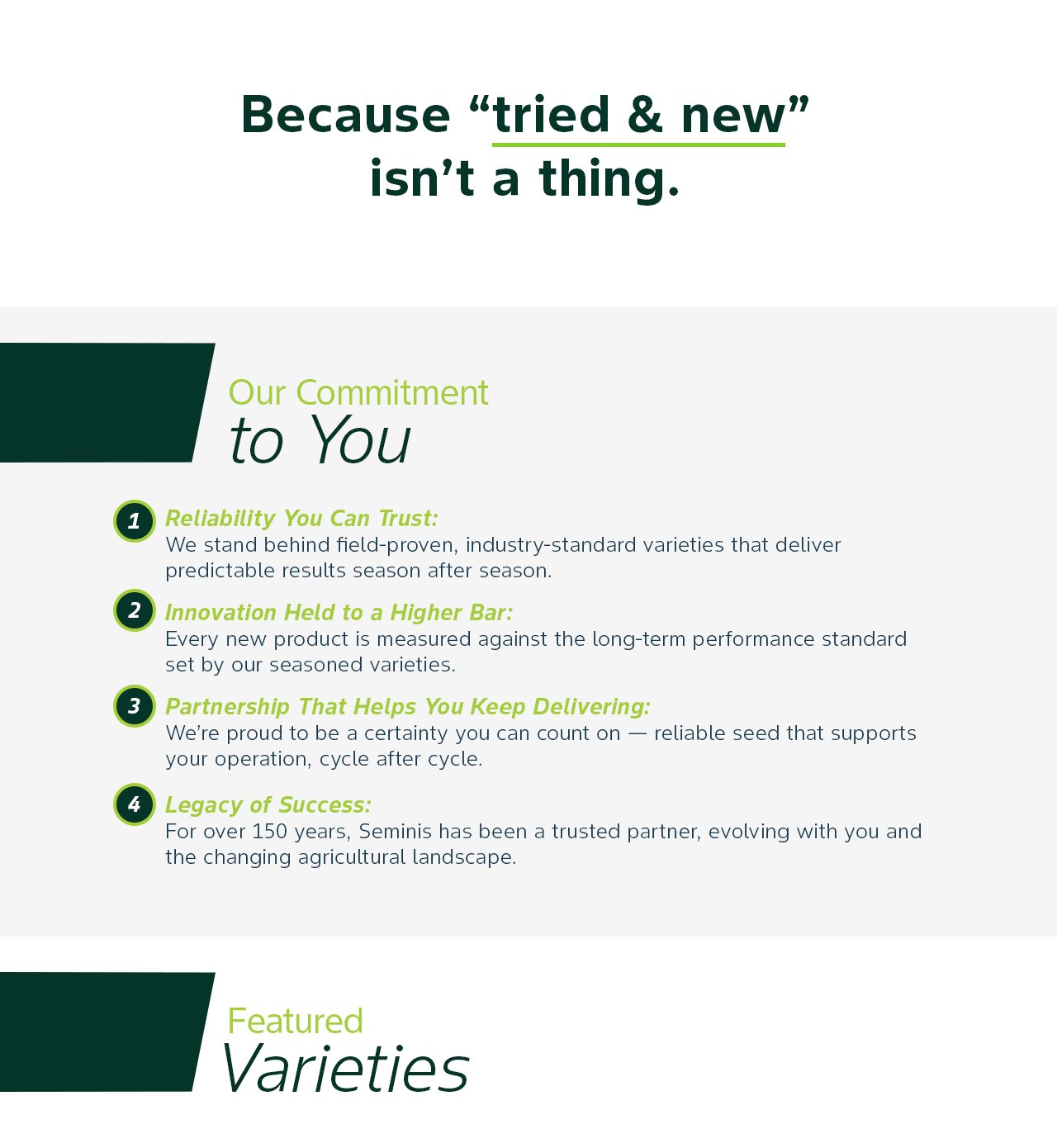 For over 150 years, we’ve been helping growers like you face every challenge wit confidence. We are committed to developing varieties growers can depend on. Our legacy is built on genetics that combine proven performance with purposefu innovation — helping growers navigate changing seasons, new challenges, and evolving market demands. Reliability isn’t one feature of our work; it’s the fondation.