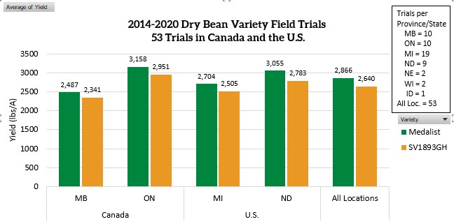 SV1893GH is a full season navy bean variety with approximately 49 days to 50% bloom and 102-106 days to harvest maturity (1458 heat units, base 50 F). SV1893GH has a determinate bush plant type with average height of 18 inches (46 cm), good plant habit, high pod position and good plant standability suitable for direct harvest. SV1893GH has smooth medium green leaves, cream colored flowers, light green pods that mature to a light tan color and averages 5.5 seeds per pod. SV1893GH has High Resistance to Bean common mosaic.