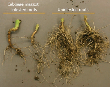 » Cabbage maggot larvae damage roots of cruciferous crops reducing yield potential.