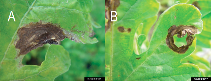 Figure 1. Foliar symptoms of gummy stem blight on watermelon. (A) Initial symptom of a brown, necrotic lesion near the leaf margin. (B) With time, the center tissue can crack and fall out of the lesion. Gerald Holmes, Strawberry Center, Cal Poly San Luis Obispo, Bugwood.org.