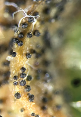 Figure 3. Black fruiting bodies of the fungus form in the necrotic tissues of leaf, stem, and fruit lesions.