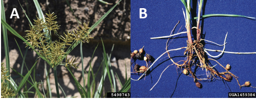 Figure 1. (A) The foliage of yellow nutsedge is bright green, and the flower heads are golden-yellow to light-brown. Howard F. Schwartz, Colorado State University, Bugwood.org. (B) Yellow nutsedge tubers are formed singly at the ends of rhizomes. Steve Dewey, Utah State University, Bugwood.org.
