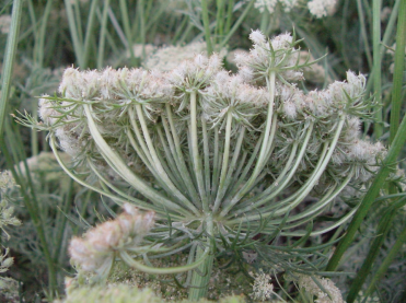 Figure 3. Powdery mildew colonization of the umbel (flower cluster) of a carrot. Lindsey du Toit, Washington State University.