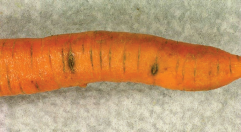 Black rot, caused by the fungus Alternaria radicina, occurs worldwide in most carrot-producing regions. While the disease mainly affects the crown and upper taproot, the pathogen can also cause seedling damping-off and blighting of the leaves and umbels.1,2