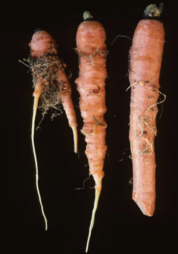 Pre-plant soil treatments can be applied to help reduce RKN populations. The application of soil fumigants, such as metam sodium, 1,3-dichloropropene, and chloropicrin, can be used to help lower populations. Non-fumigant nematicides, which can be pre-plant broadcast and incorporated or applied in-furrow, are also available, as are a couple of bio-control agents.3,4 Adjusting planting time to avoid times when juveniles are most active can help prevent infection of young roots. Recommended temperature ranges for planting depend on the RKN species present. Planting when temperatures are below 59° to 64°F (15° to 18°C) can help delay infection of taproots by several of the RKN species. However, for fields with M. hapla, planting when temperatures are below 55° to 57°F (13° to 14°C) is required. Effective resistance for root knot nematodes is not available in commercial carrot varieties.1,3,4