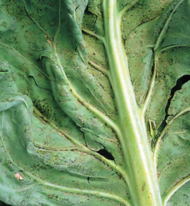 The primary inoculum source of CaMV is infected brassica crops or cruciferous weeds. The virus is transmitted to the crop by many species of aphids, such as the cabbage aphid, the false cabbage aphid and the green peach aphid. Aphids can acquire and transmit CaMV within one minute of feeding on an infected plant. Temperatures between 16- 20°C (61-68°F) favor symptom expression in plants. CaMV is often found as a mixed infection with Turnip mosaic virus, resulting in more severe symptoms than when either virus is present alone.